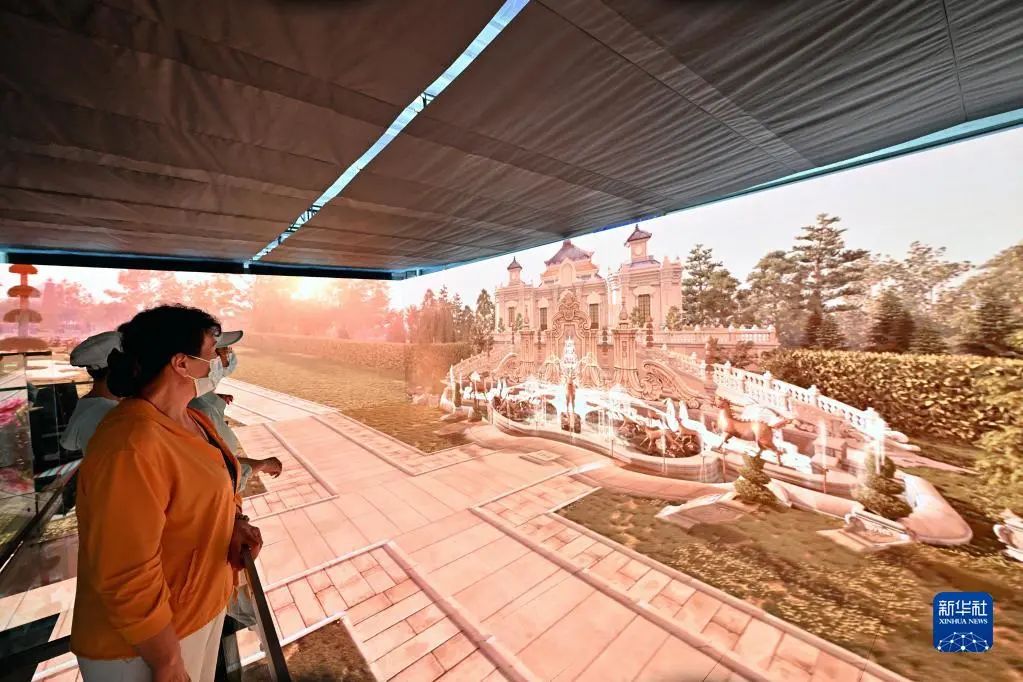 参观者在2022年中国国际服务贸易交易会文旅服务专题展良业夜游展台的《千机圆明》沉浸体验空间内欣赏数字技术模拟的圆明园景象(2022年9月5日摄)。新华社记者李鑫 摄
