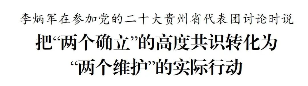 10月16日下午,党的二十大代表、省委副书记、省长李炳军在参加党的二十大贵州省代表团讨论时说,要深刻领悟“两个确立”的决定性意义,自觉把“两个确立”的高度共识转化为“两个维护”的实际行动,把党的二十大精神落实到经济社会发展各方面、各环节,推动贵州高质量发展和现代化建设取得新的更大成绩。