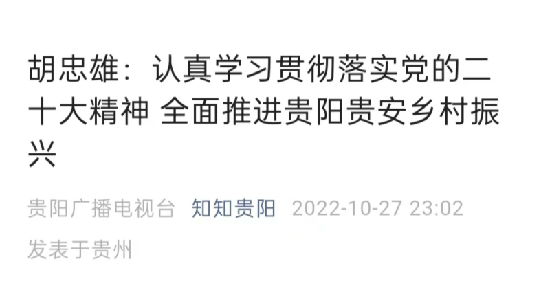 10月27日,省委常委、贵安新区党工委书记胡忠雄在贵安新区高峰镇龙宝村宣讲党的二十大精神。他强调,要把深入学习宣传贯彻落实党的二十大精神作为首要政治任务和长期战略任务,深入学习贯彻党的二十大对三农工作的决策部署,结合贵阳贵安实际逐项细化落实,扎实做好贵阳贵安新时代新征程三农工作,全面推进贵阳贵安乡村振兴。