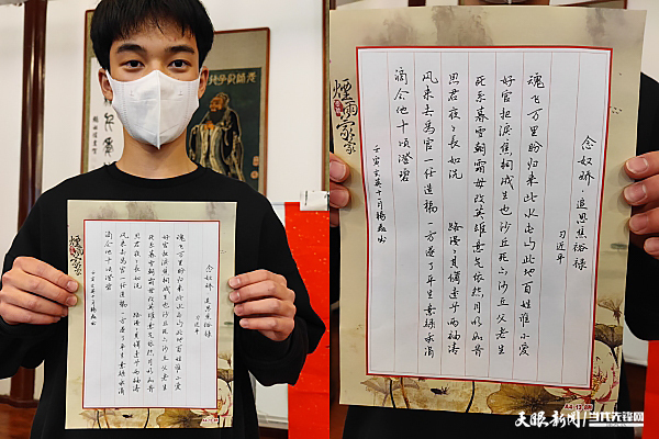 在书法创作环节,同学们从中华优秀传统文化——书法入手,纷纷挥毫写出自己的学习心得,现场书写创作了“学习宣传贯彻党的二十大精神”“踔厉奋发 勇毅前行”“生在红旗下 长在春风里”“念奴娇•追思焦裕禄”等书法作品,彰显青春赤诚,抒发时代情感。