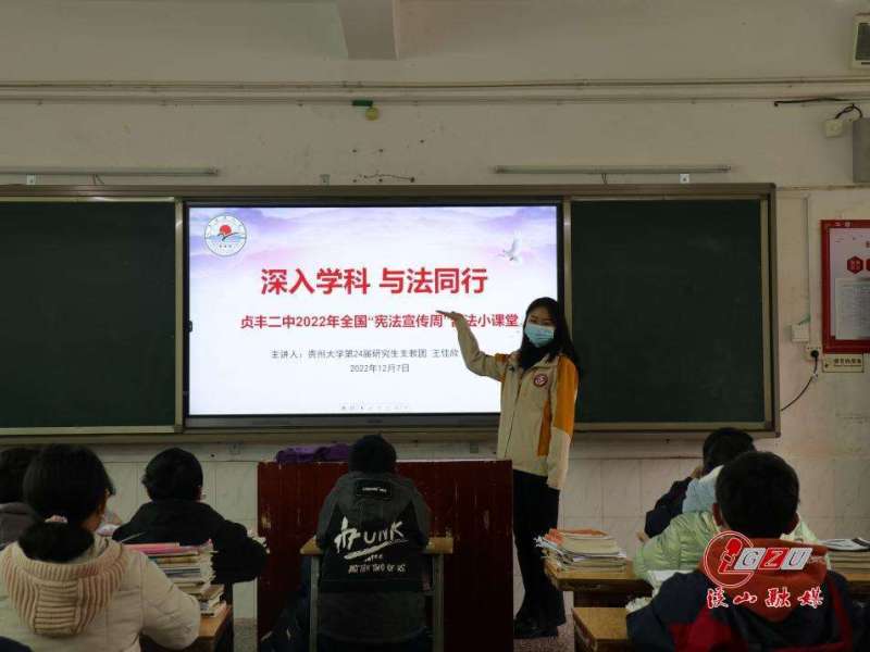 贵大新闻网讯(文字/田家园 摄影/姚靓靓)12月4日是我国第九个国家宪法日。为进一步引导青少年树立知法、懂法、守法的法治意识,弘扬宪法精神,坚定法治信仰,12月7日,我校第24届研究生支教团贞丰支队成员利用校园课堂主阵地,结合自身学科特色,在贞丰县第二中学开展全国“宪法宣传周”普法活动。