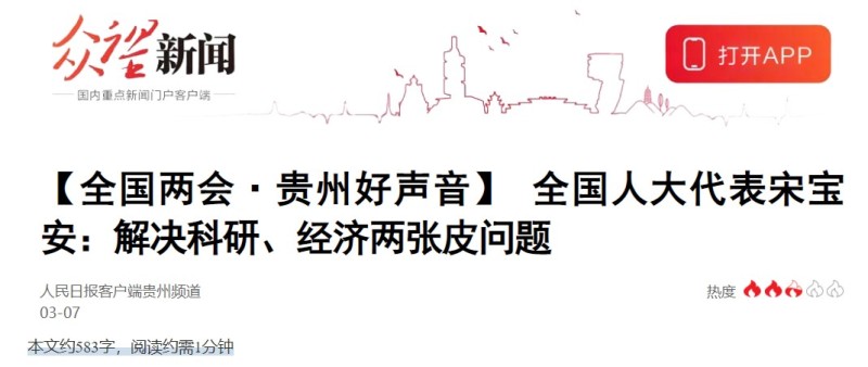 日前,在十四届全国人大一次会议·贵州代表团云连线集中采访活动上,贵州大学校长、党委副书记宋宝安院士介绍了贵州大学在人才培养和科研方面的情况。