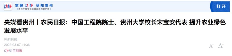 今天(3月7日),农民日报刊发《中国工程院院士、贵州大学校长宋宝安代表 提升农业绿色发展水平》。