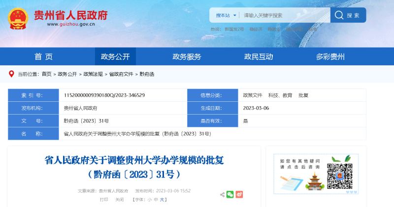 省人民政府关于调整贵州大学办学规模的批复黔府函〔2023〕31号
