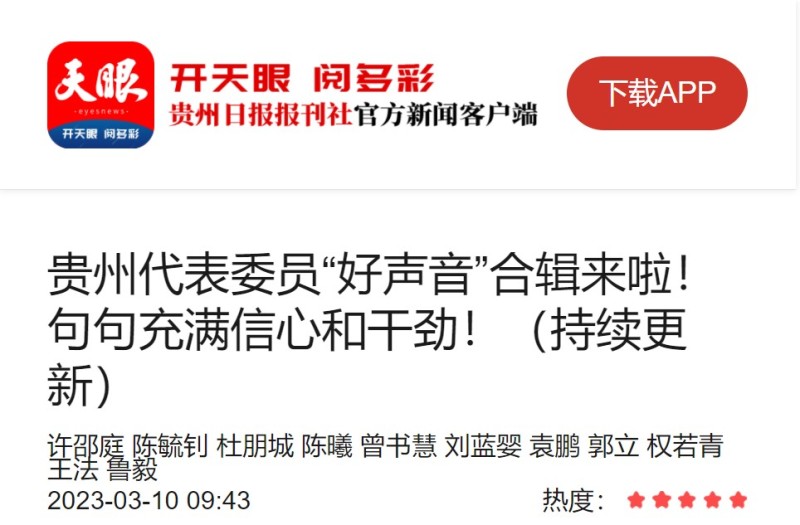 党的二十大擘画了全面建设社会主义现代化国家、以中国式现代化全面推进中华民族伟大复兴的宏伟蓝图,吹响了奋进新征程的时代号角。今年全国两会,是全面贯彻落实党的二十大精神开局之年的重要会议,是我国人民政治生活中的大事。贵州省全国人大代表、住黔全国政协委员心潮澎湃,积极为百姓代言、为发展献策,一起来听贵州代表委员“好声音”!