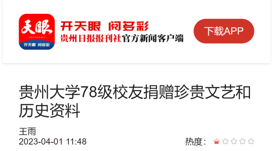 3月31日,贵州大学在东校区音乐学院音乐厅举行捐赠仪式,贵州大学1978级校友向母校捐赠重要的文艺科研资料和珍贵历史档案材料。