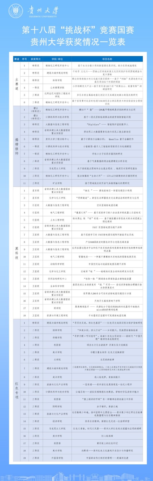 在终审决赛中,贵州大学共斩获国赛11个特等奖,其中主赛道3个特等奖,揭榜挂帅5个特等奖和2个擂主,红色专项1个特等奖,黑科技2个特等奖(“星系级”),四个赛道同时实现该校此前特等奖“新”的突破。此外,还获得3个一等奖,15个二等奖,25个三等奖,获得优胜杯,赛事总积分和各赛道获奖数量均居全国前十,创该校“挑战杯”历史最好成绩!