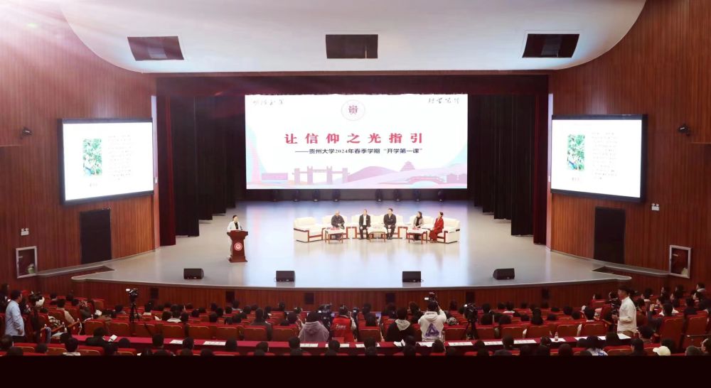 贵州大学2024年春季学期“开学第一课”以校园宣讲的方式,3月13日在西校区溪山剧场开讲。校党委书记杨未主持并作宣讲。学校1992级优秀校友、贵阳孔学堂文化传播中心党委委员、副主任周之江,贵州大学农学院院长潘学军,计算机科学与技术学院院长秦永彬,心理健康教育咨询中心杨满云副教授,传媒学院硕士研究生蔡佳分别进行宣讲。