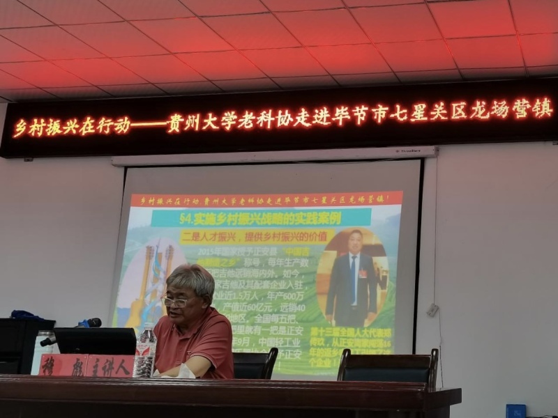 贵州大学老科协常务副会长穆彪为全镇干部群众作题为“乡村振兴战略在龙场营”的报告。他从国家乡村振兴战略的宏观视角出发,紧密结合龙场营镇的实际情况,深入浅出地阐述了科技在乡村振兴中的关键作用。同时,他就利用科技手段提升农产品质量、拓宽销售渠道及发展乡村旅游等方面,提出了切实可行的思路和实例。报告内容既具理论深度,又贴近实际,受到现场听众的一致好评。