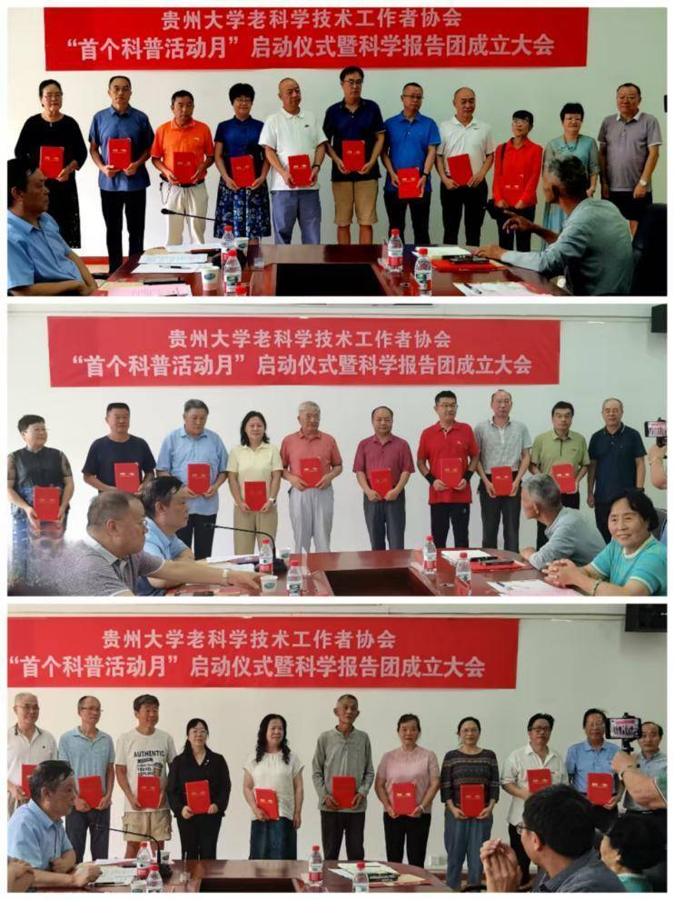 贵大老科协深入贯彻落实关于科技创新与科学普及“两翼理论”,响应《中华人民共和国科学技术普及法》和全国科技大会精神。经遴选组建银龄科学报告团,今天银龄科学报告团正式成立。省老科协副会长方荣基、副会长欧阳青山、贵大科技研究院副院长兼贵大科协秘书长甘秀海莅临分别为银龄科学报告团团员颁发了聘书。