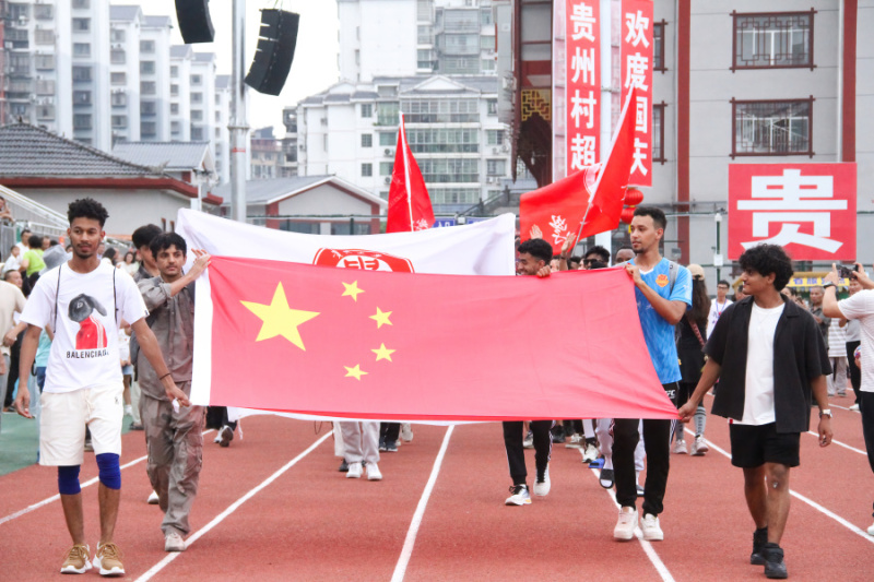“现场的观众朋友们,让我们掌声欢迎贵州大学留学生代表队入场。”伴随着解说员富有感染力地解说,现场气氛热烈。队员们一边挥舞着旗帜,一边与看台上的观众挥手互动,开启了贵大留学生与贵州“村超”的动人故事。