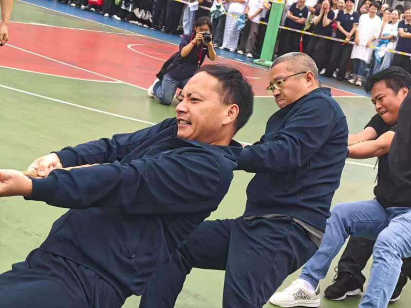随着裁判员一声令下,比赛正式拉开帷幕。参赛教职工选手们卯足了劲、咬紧牙关,紧握长绳、重心后沉,双方身体与地面呈45度角往后倾,麻绳被拉得笔直,场面紧张激烈起来。赛场上整齐的“一、二”助威声与场边观众的加油喝彩声此起彼伏,将比赛氛围一次次推向高潮。从起初的僵持不下到最终的坚持突破,每一支队伍都展现出“拧成一股绳”的团队凝聚力与不服输的拼搏精神。