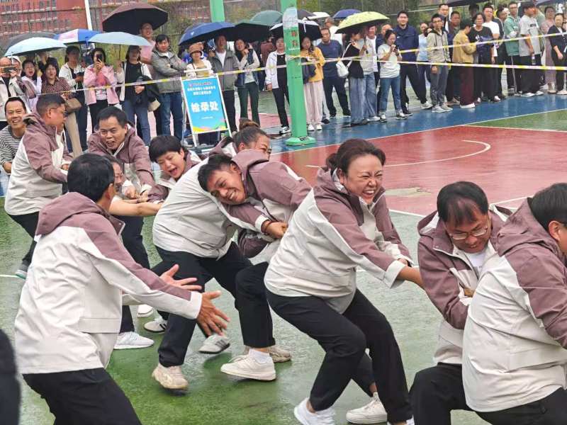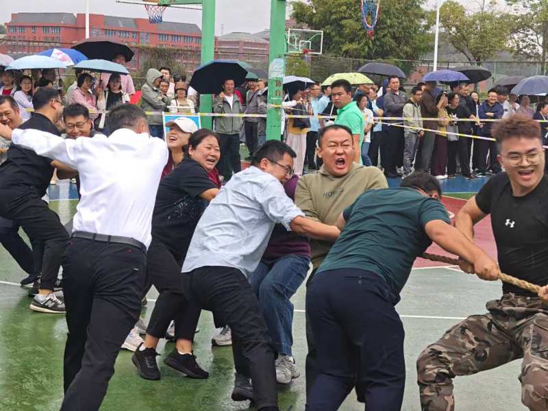 比赛途中,场地下起了细雨,但是参赛教职工选手们的激情与比赛进程的激烈程度仍不减。尽管满脸是汗水与雨水,双手勒得通红,却无一人松懈,依旧死死紧握绳索,双脚蹬地用力。参赛队员们凝心聚力、团结一致,用力量与汗水诠释着“风雨无惧”的顽强拼搏精神。