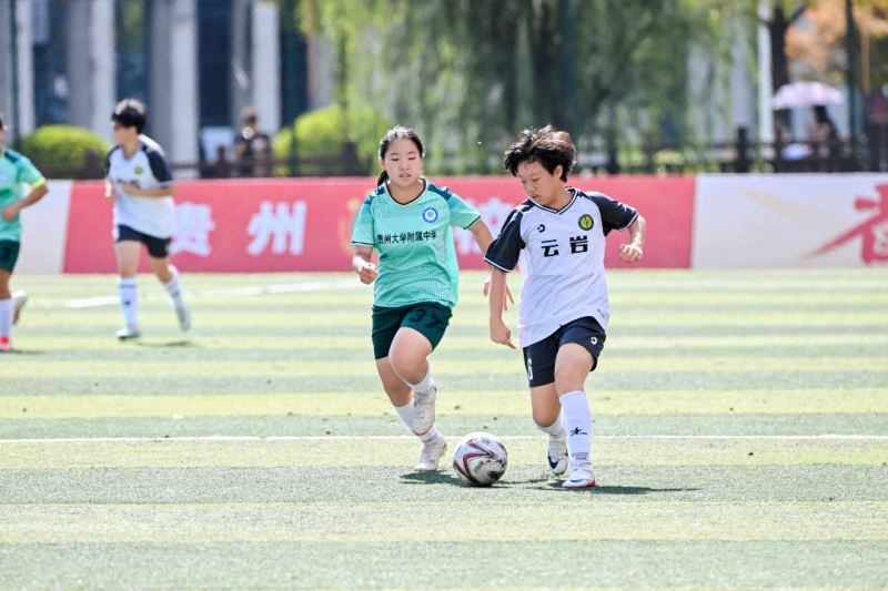 上午9时许,揭幕战哨声一响,赛场即刻成为青春竞技的舞台。贵州大学国际折耳根队开场5分钟便发起凌厉攻势,一记抽射直奔球门,虽被对方守门员稳稳扑出,却瞬间点燃全场气氛。球员们在绿茵场上全力奔跑,传球、带球、攻防转换间尽显竞技风采,每一次抢断与突破都伴随着看台的阵阵惊呼。同期进行的女子组比赛中,贵大附中小玫瑰队与北京市日坛中学贵阳分校日坛毛辣果队的对决同样扣人心弦,姑娘们的顽强拼抢赢得全场持续喝彩。