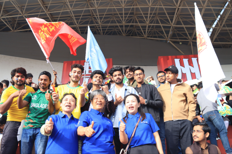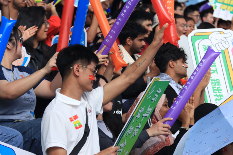 看台上,贵大师生构筑起最热情的“第十二人”阵营。战鼓雷动中,各色旌旗随呐喊声挥舞,“折耳根加油”“小玫瑰最棒”的助威声此起彼伏,与赛场边的裁判哨声交织成独特的交响。文学院的学生们自制了主题横幅,师生组成啦啦队,用整齐的口号为球员鼓劲;几位退休教师带着小马扎专程赶来,不时为双方的精彩表现鼓掌,“看着孩子们在场上奔跑,比自己年轻时打球还激动”。