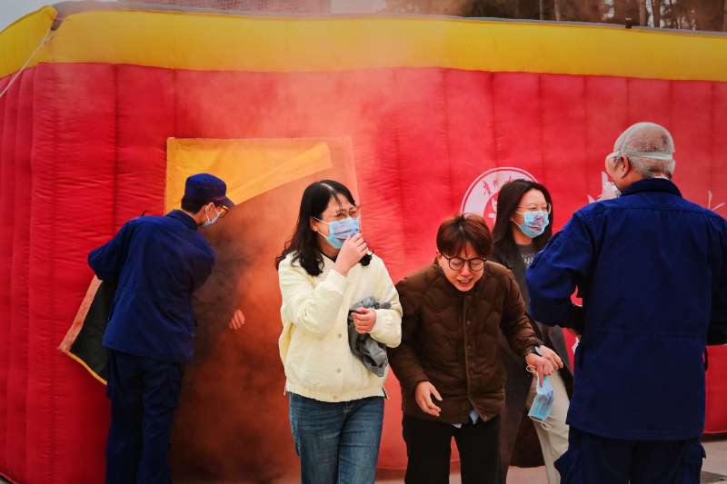 本次培训特别设置了消防逃生演练环节。现场搭建的“火灾体验屋”模拟了充满浓烟、光线昏暗的火灾现场环境。参训教职工在专业人员引导下,弯腰低姿,用湿毛巾捂住口鼻,依次进入并快速通过体验屋,切身感受了火场的紧张氛围,学习并实践了在紧急情况下如何保持冷静、安全疏散逃生的关键技巧。