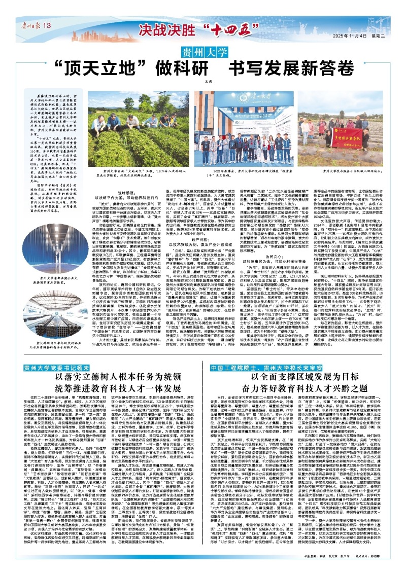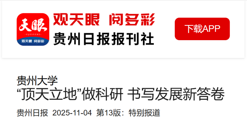 国际学术期刊《自然》的理论突破,到田间地头的丰收喜悦;从数字经济的前沿探路,到乡村振兴的生动实践,贵州大学正以科技为笔,在黔山贵水间挥毫泼墨,书写着报国为民的时代答卷。