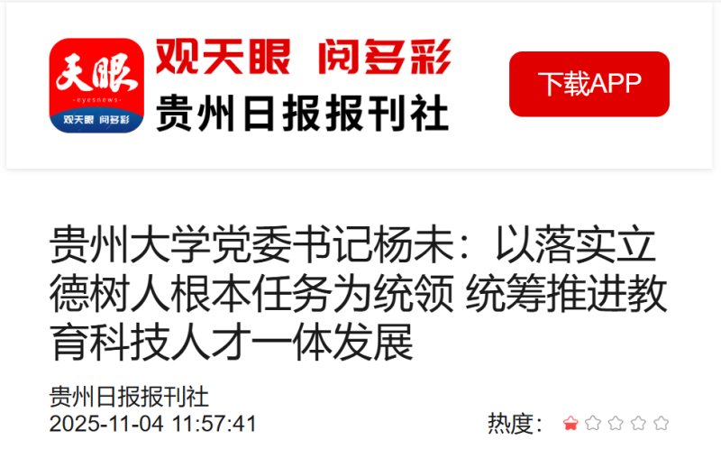 坚持立德树人,着力培养时代新人。坚持“价值塑造、能力培养、知识传授”三位一体。注重思政引领,坚持不懈推进铸魂育人,实施新时代立德树人工程。构建“大思政”育人新格局,抓好思政课育人主渠道,强化各门课同向同行,坚持“五育并举”,以“书香浸润·典耀溪山”系列读书活动、“高校青年·思想论坛”“艺术思政课”“场馆思政课”“田野思政课”等“大思政课”启智润心。创新育人模式,以制度创新破解教育、科技、人才协同壁垒,将立德树人要求融入各环节。推进“马院+书院”协同育人;抓好“一站式”学生社区育人载体提质增效;以“做人·做事·做学问”系列校园学者讲座等活动,持续开展价值引领教育;实施“博士村长”“博士工程师”计划、“四大文化工程”及寒暑期“三下乡”等实践活动,引导学生将论文写在贵州大地上。强化育人体系,坚持“五育并举”,构建“树德、增智、强体、育美、爱劳”全面发展的育人体系。将创新创业教育融入育人全过程,打造“教学—竞赛—孵化”全链条双创教育生态,连续五年获中国国际大学生创新大赛国赛金奖,2025年金奖数突破10项,实现人才培养与社会需求的有效对接。