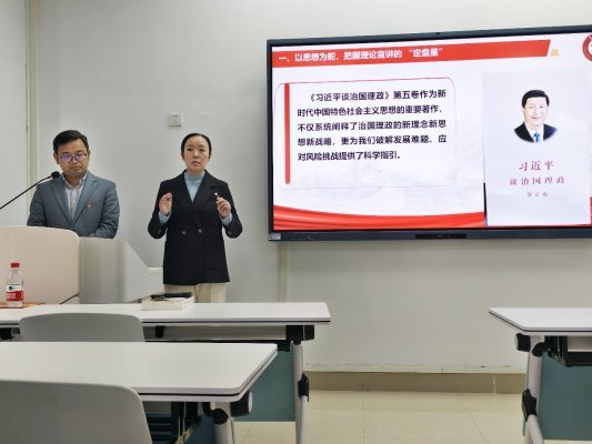 贵大新闻网讯(材料与冶金学院 供稿)11月12日,贵州省委宣讲团成员、贵州大学材料与冶金学院辅导员李云,以及学院材料科学与工程教研室教工党支部书记万明攀以“理论宣传二人讲”形式,为2025级学子带来一场主题为“深入学习《习近平谈治国理政》第五卷相关内容在中国式现代化进程中贡献贵州‘钢铁人’的新力量”的宣讲,宣讲分别从思想引领、内涵阐释、实践赋能三个方向进行介绍。