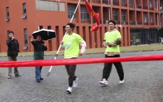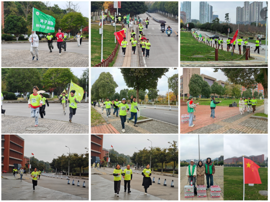 赛前,体育指导员带领全体跑团成员开展系统热身,为安全奔跑筑牢坚实基础。随着裁判一声清脆的发令枪响,跑团成员们紧随队旗,沿着预设线路奋勇出发。赛道上,师生们齐头并进、步履铿锵;路口处,志愿者手持鲜艳的五星红旗守护跑道安全,成为移动的“安全屏障”;沿途行人与车辆纷纷驻足礼让、呐喊助威,暖意与活力在校园间流淌。阅湖升旗台的五星红旗高高飘扬,与志愿者手中迎风招展的红旗交相辉映,勾勒出一幅“一圈一点、同心同向”的动人图景;跑团成员身着亮绿色服装,志愿者身着深绿色马甲,一主一辅、相映成趣,在校园中铺就出两道灵动的风景线。青年学生朝气蓬勃、身姿矫健,青年教师意气风发、步伐稳健,中年教师活力焕发、坚守不懈,三重脚步声交织共振,宛如一曲和谐奋进的校园乐章。