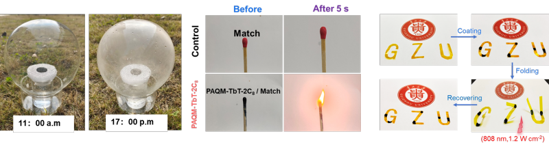 基于该分子设计策略构建的材料在两种光源条件下均展现出优异的光热转化性能,突破了有机光热材料在太阳光与激光双模式驱动下难以兼容的科学瓶颈。实验结果显示,采用该材料构建的界面蒸发器在模拟太阳光条件下表现出超越现有纯有机体系的蒸发速率;在808 nm 激光照射下,样品局域最高温度可达356.0 °C,达到国际领先水平。目前,团队已完成户外太阳光实际测试,并成功演示了激光点火、形状记忆驱动等高温应用场景,验证了从基础材料到功能样机的可行性。