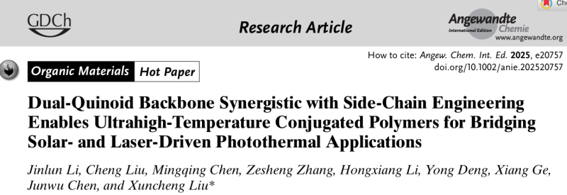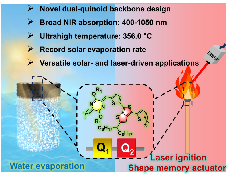 贵大新闻网讯(通讯员 刘迅成)近日,贵州大学材料与冶金学院刘迅成团队在有机半导体材料领域取得重要研究进展,相关成果发表于国际顶级化学期刊Angewandte Chemie International Edition(德国应用化学国际版),并被遴选为热点论文(Hot Paper)。团队创新提出的“双醌主链+侧链工程”分子设计策略,使单一有机半导体材料同时具备高效的广谱太阳光吸收能力和对窄带激光的强烈响应,实现了“白昼低温、长时收能”与“按需瞬时、高温输出”并存的双模式光热功能,为有机光热材料迈向应用化和工程化开辟了新路径。
